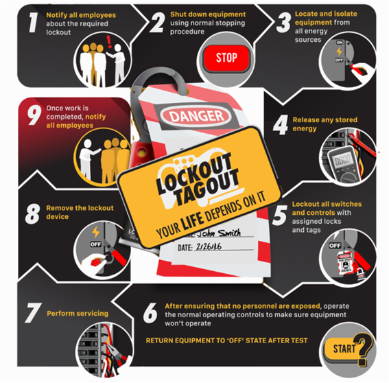 - Restore equipment to service: After completing the work, follow established procedures for removing Lockout/Tagout devices, re-energizing the equipment, and returning it to service.